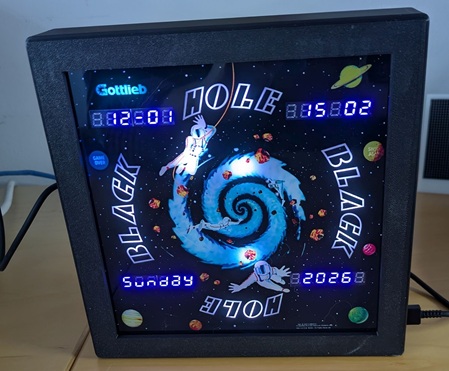 A pinball-themed clock. Displays time, date, day of week, and year across four 6-digit TM1637 LED displays, with a programmable LED strip, MP3 audio playback, Text-to-Speech, and automatic time synchronization via WiFi (NTP) or a DS3231 RTC module.