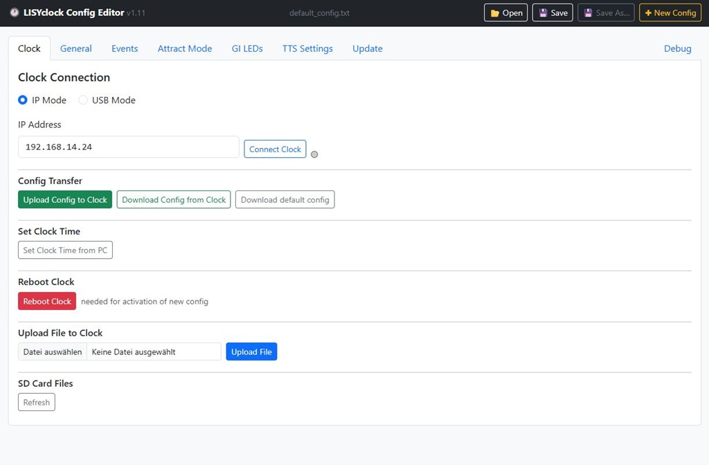 The clock can be configured to your needs with a textfile (config.txt) on the integrated SD card. You can edit the config directly or use my 'LISYclock Config Editor' (Browser App) for this. Due to security restrictions the LISYclock_config_editor.html file need to be copied to your local disc and be executed from there!